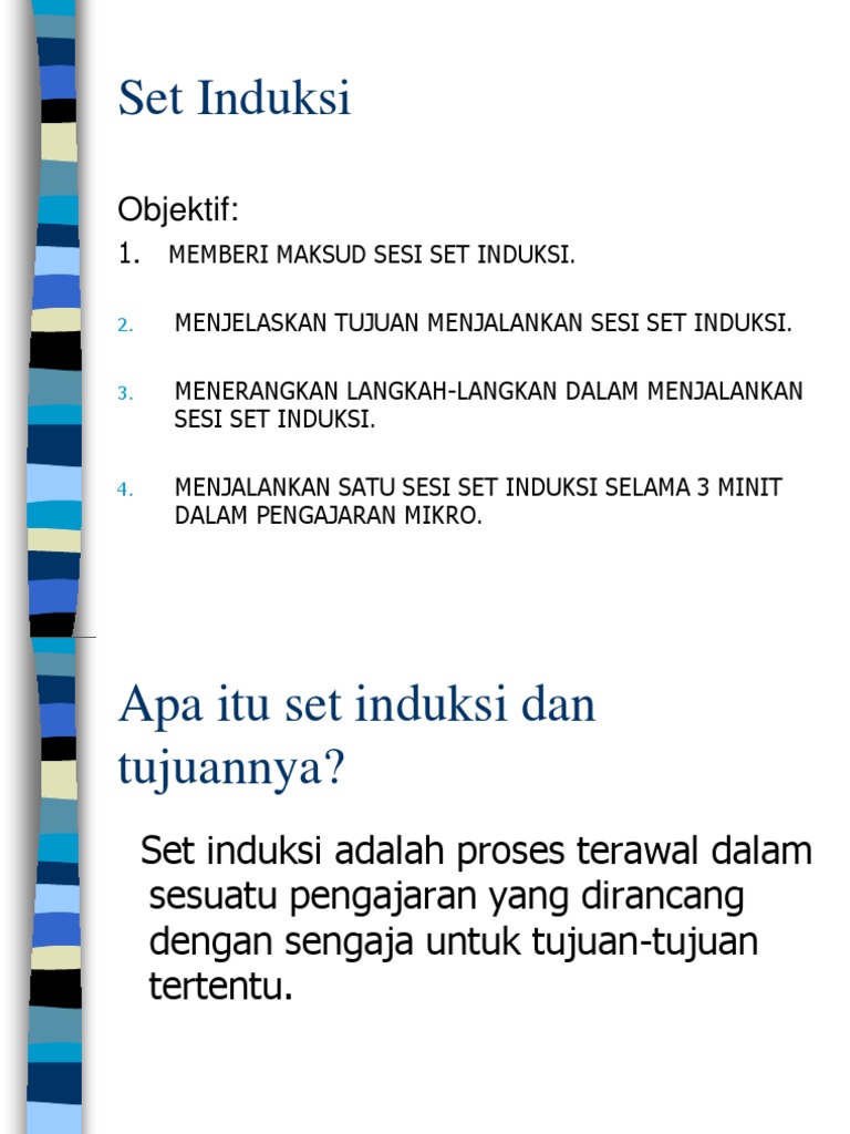 Set induksi merupakan satu set pembelajaran untuk memulakan sesuatu pdpc yang melibatkan idea teknik proses aktiviti dan sumber bagi menarik. Menarik minat pelajar langkah pelajaran yang. Oleh itu guru-guru haruslah merancang set induksi yang menarik supaya PdPc dapat dilaksanakan secara berkesan.